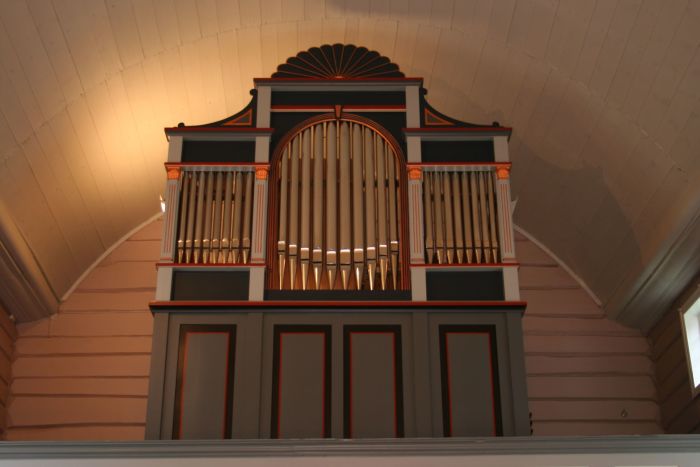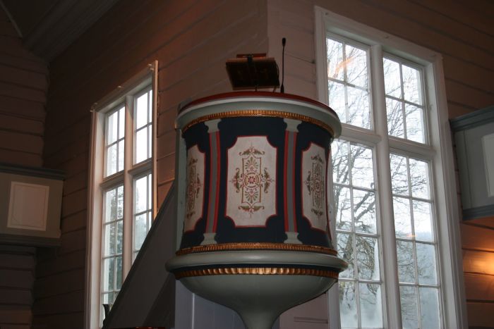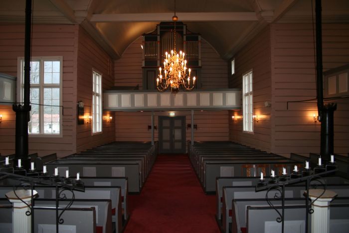 Laftetømmeret er synlig inne i kirken. Veggene var umalt til 1934, da malermester Norvald B. Nielsen stod for malerarbeidet. Senere er kirken malt innvendig i 1984. Det er orgelgalleri innenfor inngangen og gallerier også i tverrarmene og til og med i koret bak altertavlen. Koret åpner seg mot kirkerommet i sin fulle bredde, og korgulvet er hevet tre trinn over resten av kirkegulvet. Prekestolen henger på hjørnet mellom koret og søndre tverrarm og har oppgang fra koret. Stilen er utpreget empire, som man kan forvente ut fra kirkens alder, men kirkeleksikonet daterer den til 1870.
