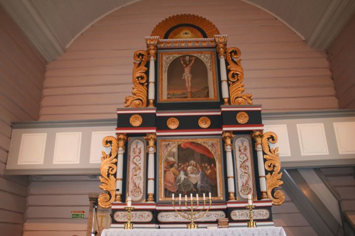 Altertavlen sies å være fra 1820. Den skal ha blitt malt av Salve Olsen Listad i 1847 og igjen av Christian Kastrud i 1870. Forfatteren av jubileumsboken er usikker på om dette arbeidet omfattet bildene av nattverden og korsfestelsen i de store midtfeltene, eller om disse ble innkjøpt separat. I kirkeleksikonet tilskrives de Listad og dateres til 1847, hvilket formodentlig betyr at menigheten rapporterte dette rundt 1993. Tavlen skal ha blitt noe utbedret av Ola Seter i 1948.