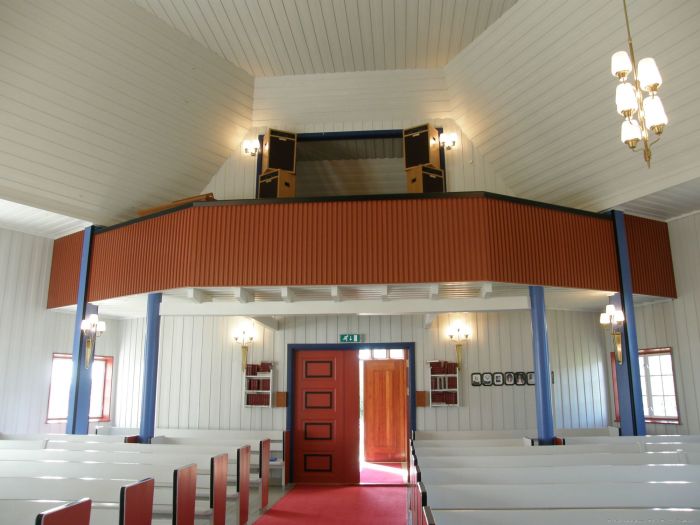 Det er orgelgalleri innenfor inngangen og kor i øst med et støpejernskors på korbjelken. Korgulvet er hevet tre trinn over skipets gulv.