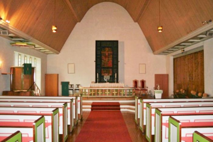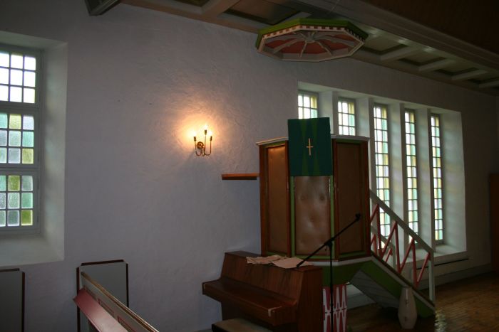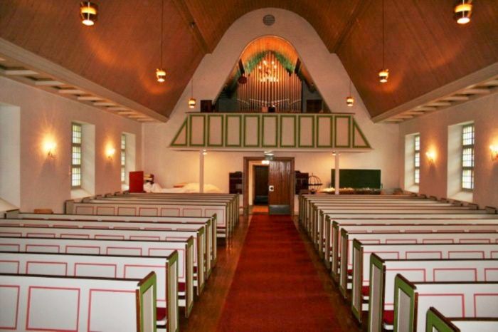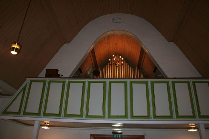 Det er orgelgalleri ved inngangen. Koret er under samme tak som skipet, med gulvnivå hevet to trinn.