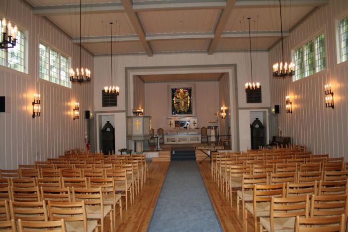 Interiørfargene er fra 1970-årene. Alterbildet er et glassmaleri av Borgar Hauglid fra 1939 som viser den oppstandne Kristus. Under dette er et lavere bilde av Jesus i Getsemane, også det av Hauglid og fra 1939. Prekestolen (med seks fag) ble laget ved Heggedal trevarefabrikk i 1935. Døpefonten er firkantet med et langt smalere firkantet skaft. Kirken hadde tidligere et Jørgensen-orgel fra 1941, men fikk i 2007 et 17 stemmers orgel bygget av Knut Kaliff. Senere har kirken også fått nytt flygel. De to kirkeklokkene (fra 1935) er støpt av O. Olsen & Søn. Kirken er mye brukt som konsertarena.