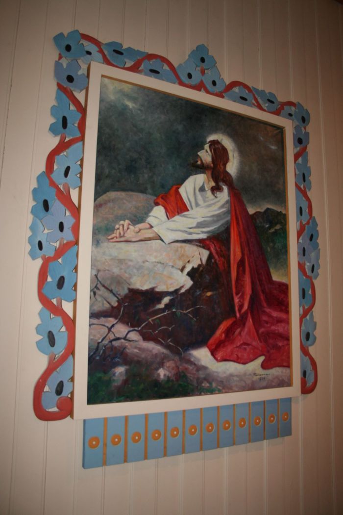 Altertavlen (signert Fosnes 1936) viser Jesus i Getsemane, kopiert etter et kjent bilde av Heinrich Hofmann. Prekestolen har seks fag hvorav fire er dekorert med fiskebensmønster. I døpefonten inngår spiler fra ribbeveggen i nevnte gymsal. Fonten er åttekantet.