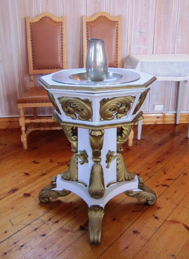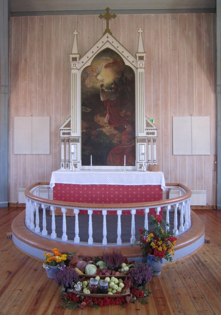 I begynnelsen hadde kirken et enkelt alter med et kors; dette korset henger nå på veggen bak prekestolen. Ved restaureringen i 1901 var det ønske om ny altertavle, og man fikk Lars Jorde til å male en kopi av Eilif Peterssens altertavle i Vang kirke fra 1879. Bildet viser Jesus i bønn i Getsemane, og rammen ble laget av Søren Bjerke. Bjerke laget også døpefonten, som er åttekantet som kirken, samt alteret og alterringen. Prekestolen har fem fag. Det første orgelet kom tidlig på 1900-tallet. Nåværende orgel ble installert i 1981. Det kommer fra Norsk Orgel- og Harmoniumfabrikk i Snertingdal. Kirkeklokkene er fra Olsen Nauen.