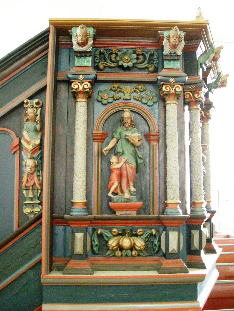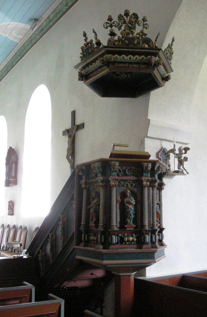 Prekestolen ble laget av Jens Strammerud i 1709. Det skal dreie seg om en ombygging av en eldre prekestol fra Deglumskirken, og én kilde antyder at Johannes Skraastad kan ha laget evangelistfigurene i den. Himlingen er formodentlig en ren Strammerud-original. Strammerud skal også stå bak to krusifikser og to lyseholdere med engler.