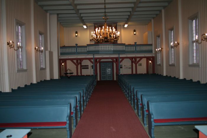 Det er orgelgalleri innenfor inngangen. Koret åpner seg mot skipet ihele sin bredde, men er litt avskjermet i høyden. Korgulvet er hevet to små trinn over skipets gulv.