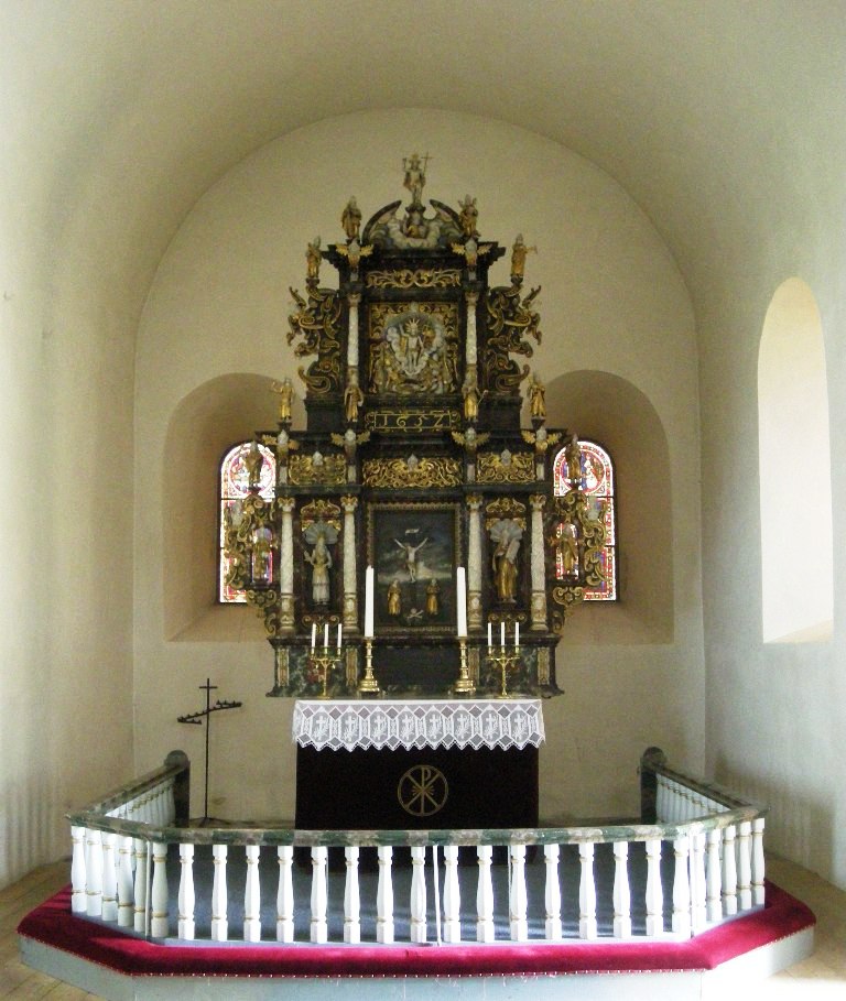 Den barokke altertavlen er fra 1652. Den har vært omtalt som en tegneserie over påskeevangeliet, med avbildninger av korsfestelsen, oppstandelsen og himmelfarten i midtpartiene. Her er faktisk ikke nattverden avbildet, skjønt det finnes vinranker og drueklaser. Ellers har man fulgt tradisjonen med at Kristus (omgitt av Maria og Johannes) ble korsfestet på Adams grav. Tavlen har også figurer av Moses og Aron og de tolv disiplene. Figurene er skåret i bjerk, og tavlen ellers er i furu og gran. Dette tas som et tegn på at tavlen er norsk, selv om kunstneren er ukjent. Hadde den vært importert, ville den trolig ha vært av eik. Tavlen ble malt om i 1784 og bærer fortsatt preg av det rent fargemessig. Altertavlen ble flyttet nærmere korets østvinduer i 1703, for i 1986 å bli flyttet tilbake slik den står i dag.