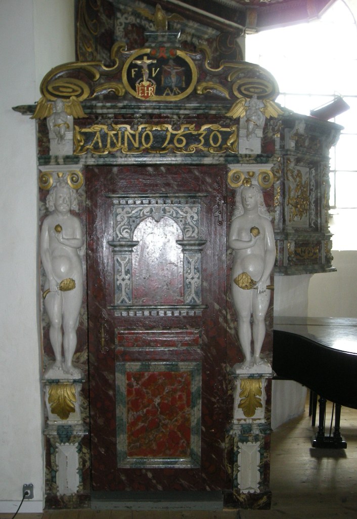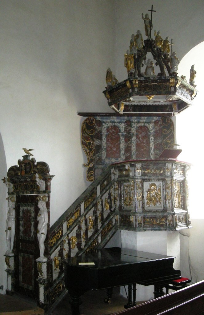 Den rikt dekorerte, barokke prekestolen var ferdig i 1630, et tall som er å finne over prekestoldøren. Stolen ble skåret av Johan Reinholdt, som også skal ha laget et epitafium som siden er gått tapt, til kirken. Prekestolen stod opprinnelig på skipets østvegg, men etter at koråpningen ble utvidet i 1703, ble stolen flyttet inn i hjørnet, med døren på sørsiden av den utvidede åpningen. På hver side av døren står Adam og Eva, og langs trappen er det felt med evangelistfigurer, mens scener fra Jesu liv er å finne i feltene rundt selve stolen. På toppen av prekestolhimlingen er det figurer av Kristus og apostlene, og på undersiden er det — jeg hadde nær sagt som vanlig — en due, symbol på den hellige ånd.