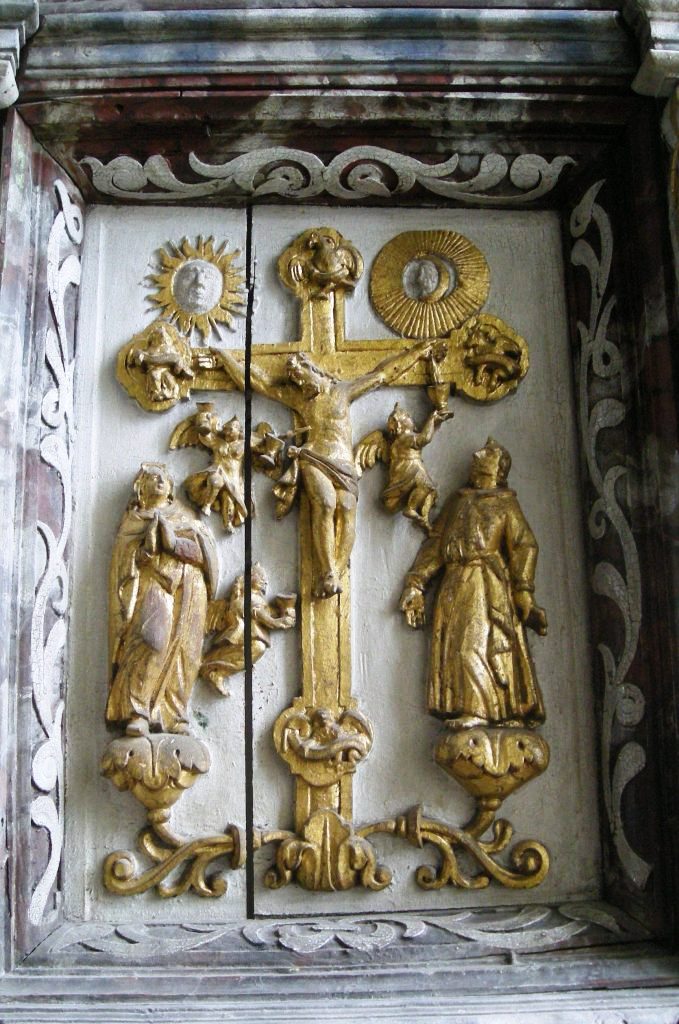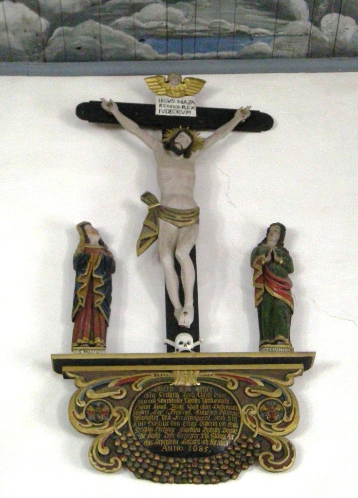 Over koråpningen henger en kalvariegruppe, den korsfestede Kristus omgitt av Maria og Johannes, fra 1685. Kirken skal ha hatt flere epitafier, men det er bare ett igjen, fra 1710, i Nykirken. Det viser prestene Kristoffer Stockflet og Nils Müller, fru Margrete Mechelburg og deres barn. Flere bilder fra Stange kirke er å finne på Folkemuseet.