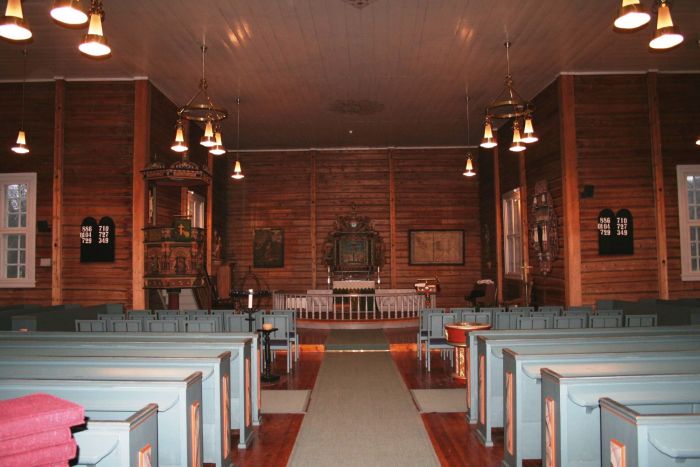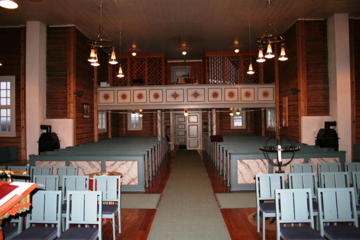Innvendig er det orgelgalleri innenfor vestinngangen. Det er kor i østre korsarm, og korgulvet er et lite trinn høyere enn skipets gulv. Det står uklart for oss hva slags inventar som var brukt i kirken i begynnelsen, men alterbildet som er avbildet rundt 1900, kan ikke ha vært i bruk i begynnelsen, for eksempel. La oss se på det som er i bruk nå.