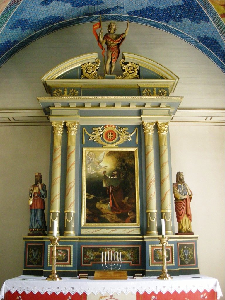 Det nåværende alterpartiet er fra denne oppussingen. Figurene av Moses og Aron og den triumferende Kristus er skåret av den lokale kunstneren Asbjørn Busterud. Muligens er det ikke en regel, men som oftest finner man Moses til venstre og Aron til høyre. Her (og i Stange) er det omvendt, og den lokale forklaringen går ut på at Moses skuer ut over Mjøsa mens Aron ser på menigheten i Vang. Peterssens maleri av Jesus i Getsemane ble satt inn i tavlen, idet et maleri av Lous Mohr ble refusert. Ikke hele maleriet er synlig, og det er ikke helt pent behandlet, idet det ble brukt som en nødløsning. Dagens altertavle har barokk innramming, mens den var nygotisk da Peterssens bilde var nytt. Figurer og annen dekor er malt av Anders Andersen. Han har også tegnet antependiet, som Birte Arneberg har laget. Lina Ladim fra Vang laget alterduk (men se ellers om jubileet nedenfor). Utskjæringene i alterringen er laget av treskjæreren A. Simensen (formodentlig Andreas Simensen). Fra alteret som ble brukt før 1879, finnes fortsatt Matthias Stoltenbergs to bilder fra 1833 hengende på en sidevegg. Stoltenberg malte også bilder av prost Vincent Stoltenberg Bull og sogneprest Even Andersen i hhv. 1829 og 1832 (nr. 15 og 16 blant presteportrettene under orgelgalleriet).