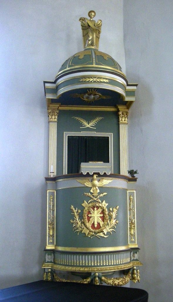Prekestolen i empire, som står til venstre (nord) for koråpningen, er tegnet av Arneberg og skåret av Anthon Røvik. Røvik har også skåret dåpsengelen, etter tegninger av Emma Mathiassen. Dekormaling er som ellers ved Anders Andersen. Døpefatet er fra 1701. Det ble laget av gullsmedmester Morten Finchenhagen og gitt i gave til kirken av Georg Reichwein og hans kone Catharina Sverdrup. Motivet på fatet er Jesu dåp i Jordanelven.