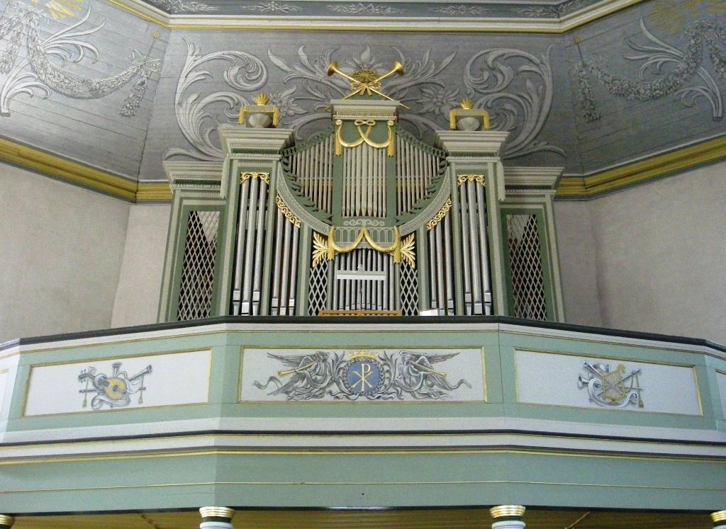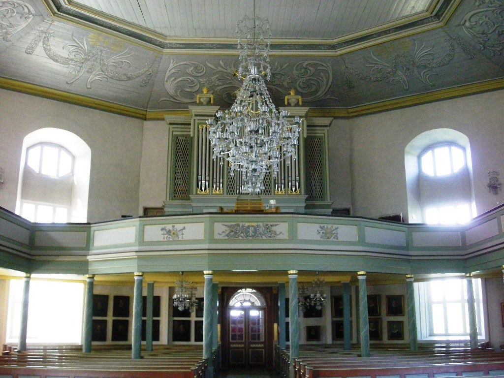 Kirken har hatt flere orgler, hvorav det første fra Christian Ingelstad (se bok) i 1810. Neste orgel kom fra Amund Eriksen i 1855, og det ble ombygget i 1877. Under disse og senere fornyelser er det opprinnelige prospektet (fasaden) beholdt, men det holdt hardt i 1916, da man skulle installere et nytt orgel fra Olsen & Jørgensen og det brøt ut en opprivende strid i menigheten. Dagens orgel er fra Norsk Orgel- og Harmoniumfabrikk. Det ble bygget i 1966 og innviet den 16. april 1967. Orgelet ble restaurert i 2011. Under orgelgalleriet henger malte portretter av 26 sogneprester. Listen er komplett fra reformasjonen til i dag med unntak av nåværende sogneprest. Abraham Pihl er nr. 14, portrettert av Johannes Flintoe.