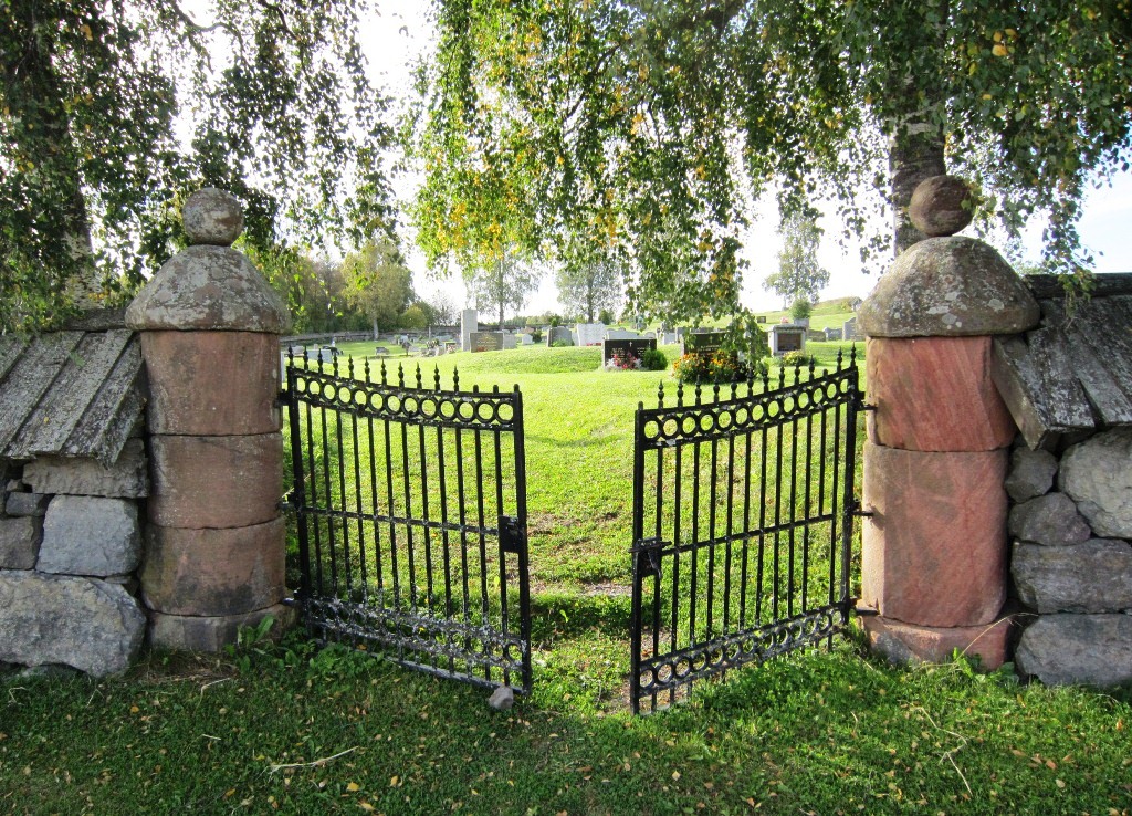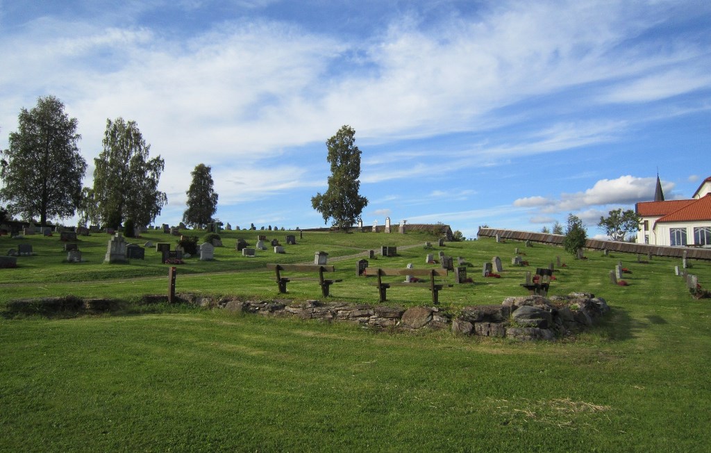Kirkegården omgir tuftene etter gamlekirken, mens dagens kirke er oppført utenfor den på nordsiden. Sør for kirkegården står ellers et krigsminnesmerke, og på nordsiden står en minnebauta over Johan Nordhagen.