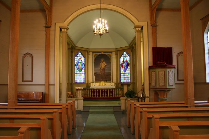 Det er orgelgalleri innenfor inngangen, og koret åpner seg mot skipet i sin fulle bredde. Korgulvet er hevet to trinn over skipets gulv. Vinduene i korets skråvegger har glassmalerier som fremstiller Paulus (med sverd, til venstre) og Peter (med nøkkel). Disse er signert G. Rognaldsen i 1933.