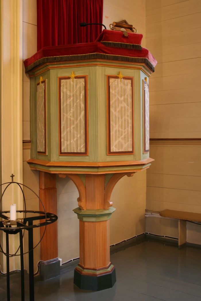 Prekestolen er den opprinnelige, men den ble flyttet inntil skipets nordvestvegg ved restaureringen i 1954–55 og har oppgang gjennom veggen fra sakristiet. Den opprinnelige døpefonten ble i et gammelt jubileumshefte beskrevet som «berre eit simpelt stativ». Ved restaureringen fikk kirken ny døpefont tegnet av Alvsaker. Orgelet er opprinnelig bygget av Olsen & Jørgensen i 1914 og kom fra Strusshamn kirke i 1964. Kirken sies å ha en stålklokke støpt av O. Olsen & Søn i 1908.
