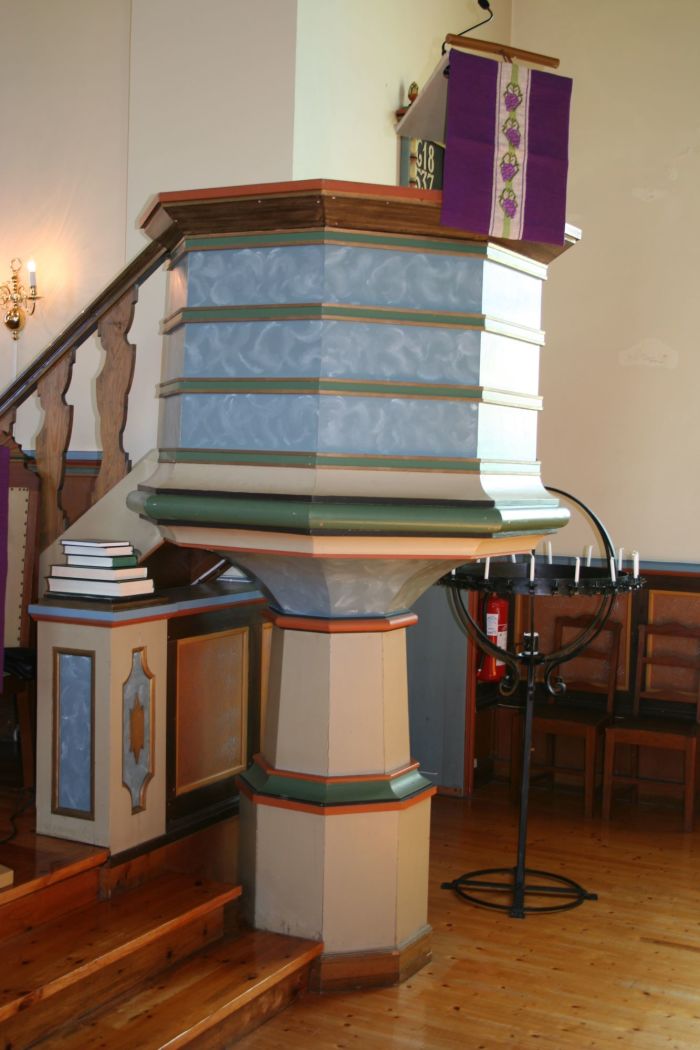 Det er orgelgalleri innenfor inngangen. Koråpningen er rundbuet. Prekestolen (til høyre for korbuen) og døpefonten er begge åttekantet. De skal være fra 1888 og altså overført fra den forrige kirken. Overført er også altertavlen, som kom til rundt 1930. (Tidligere hadde trekirken hatt et enkelt kors.) Tavlen sies å være snekret av Ivar Tangen, mens maleriet er et kristusbilde malt av Vilhelm Bjørknes (signert i 1929). Teksten under bildet lyder «Kom til meg!» og henspiller på Matt 11, 28. Alter og altertavle er sammenbygget og av samme alder. Et bilde fra 1600-tallet av Josef og brødrene hans er å finne over døren inn til kirken fra våpenhuset.