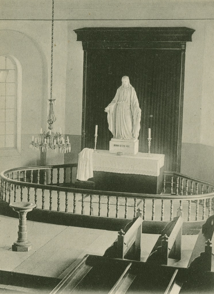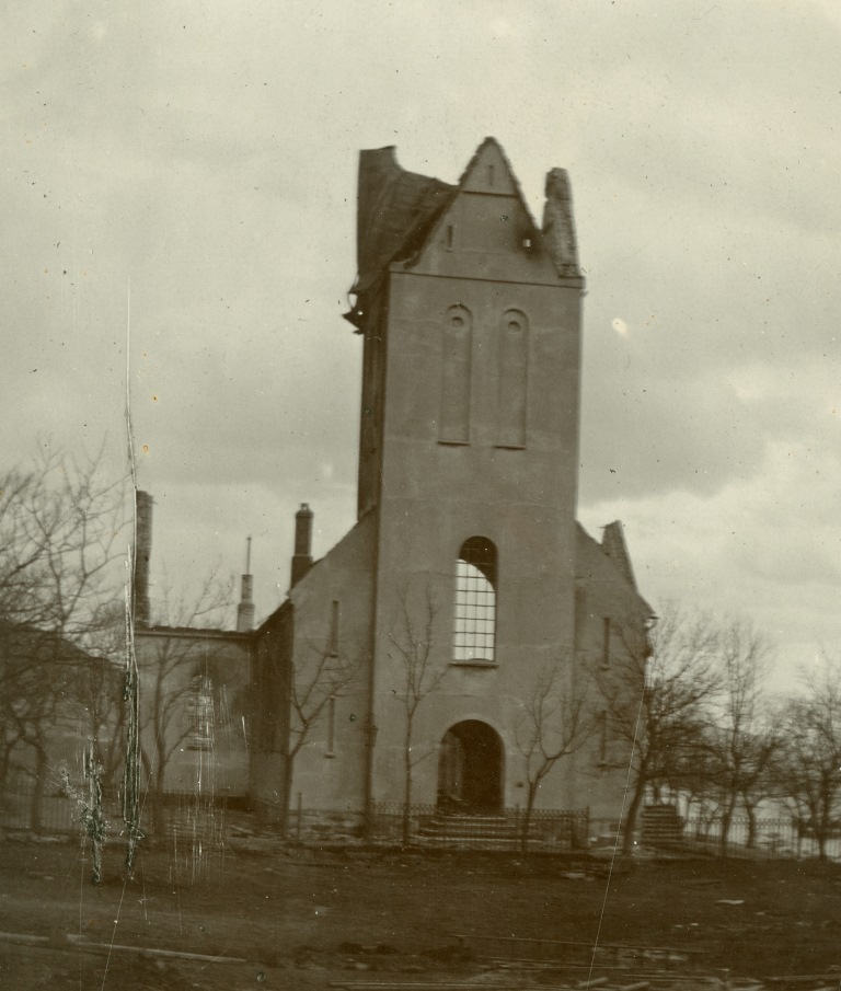 Ålesunds første kirke ble tegnet av H.E. Schirmer og var en korskirke i for det meste upusset tegl, men vesttårnet hadde pusset fasade. Den var ikke helt ulik den samtidige Strøm kirke i Odal, som ble tegnet av samme arkitekt. Formspråket var overveiende nygotisk med det viktige unntak at dør- og vindusåpninger var rundbuede. På alteret stod en stor statue, og ifølge jubleumsboken om kirken dreier det som om et kopi av Bertel Thorvaldsens kristusstatue. En kristusstatue er det åpenbart, og teksten på sokkelen er den samme som hos Thorvaldsen: «Kommer til mig!» (jf. Matt 11, 28). Foldene i kjortelen ser imidlertid ikke ut til å være helt som for Thorvaldsens original. Denne kirken gikk med i den store bybrannen den 23. januar 1904.