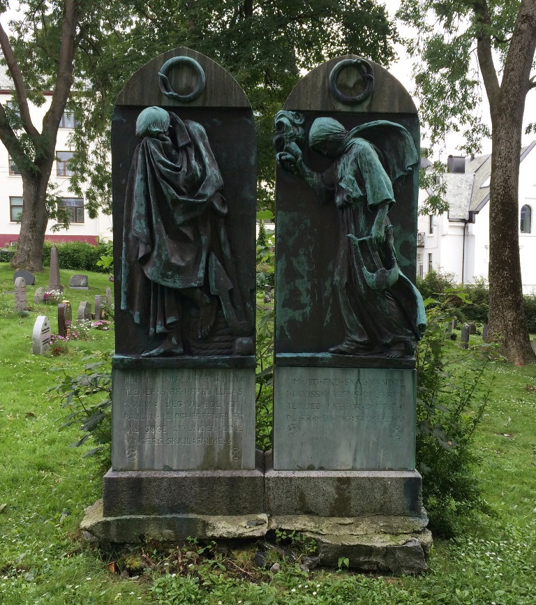 Utenfor kirken står et krigsminnesmerke, og det er kirkegård nord for kirken. Den kalles Vestre kirkegård og var byens første kirkegård, tatt i bruk samtidig med den første kirken i 1855. Den er imidlertid av begrenset omfang og uten utvidelsesmuligheter, og andre kirkegårder eller gravlunder er tatt i bruk i tur og omgang: Nordre gravlund (nord for Aksla), Nørve kirkegård og Øvre og nedre gravlund (ved krematoriet).