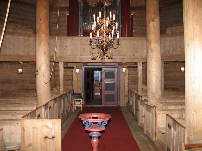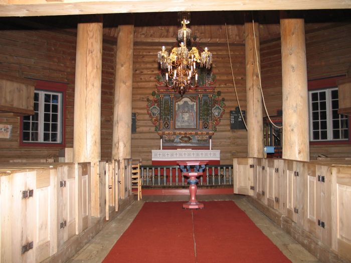 Åttekantdelene inneholder funksjonene for skip og kor. Det er galleri i vest og langs fem av de åtte veggene (med glipe der vinduene er). Koret i øst har samme gulvnivå som resten av kirkerommet, men det er en ballustrade med knefall. Vegger, søyler og benker er trehvite.