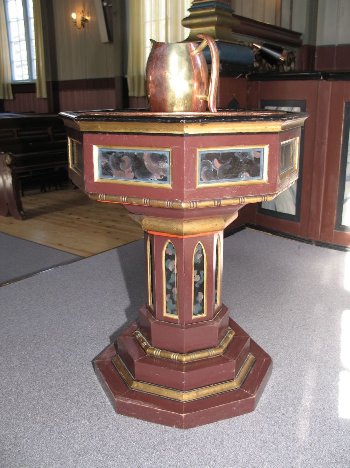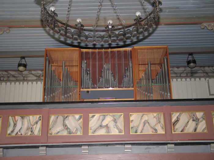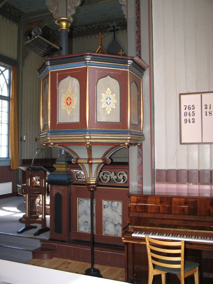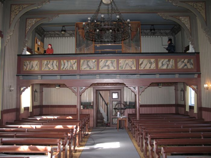 Det er orgelgalleri innenfor inngangen. Koret åpner seg mot skipet i sin fulle bredde, men er litt avskjermet øverst. Koråpningen er tredelt, og det er skranker som korskille i de to mindre sidebuene. Korgulvet er to trinn høyere enn skipets gulv. Prekestolen står i den høyre (søndre) sidebuen og har oppgang fra koret.