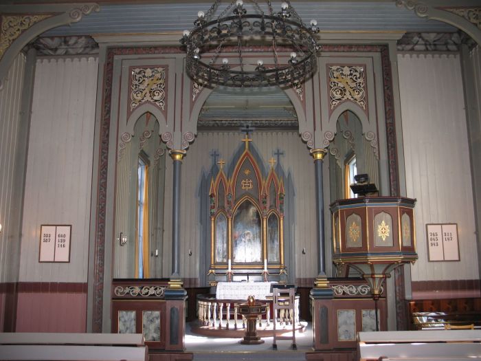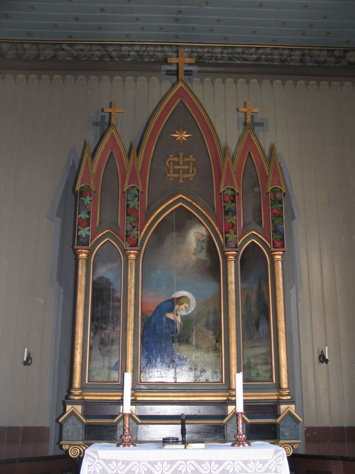 Den nygotiske altertavlen skal være laget i 1876 av brødrene Lars og Gudmund Brekken (sistnevnte utvandret senere til Amerika) etter tegninger av Christian Hovde. Tavlen er tredelt med spissbuer og har i hovedfeltet et getsemanebilde som muligens er malt av Conrad Valeur (men dette er ikke sikkert bekreftet). Ved en oppussing i 1934 ble sidefeltene malt av Ola Seter, slik at de utgjør en utvidelse av bildet i hovedfeltet.