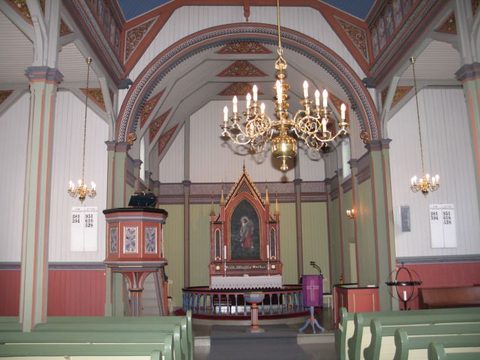 Innvendig er det orgelgalleri i vest, og koret åpner seg mot skipet i sin fulle bredde. Koråpningen er rundbuet, og korgulvet er et lite trinn høyere enn skipets gulv. Interiørfargene er fra 1963.