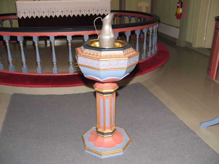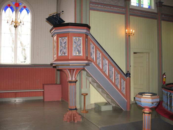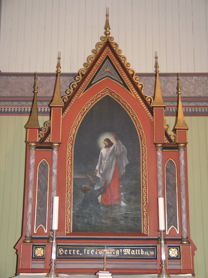 Alterbildet er malt av Conrad Valeur i kopi etter Bernhard Plockhorst. (Originalen er alterbildet i Dreifaltigkeitskirche i Hannover.) Det viser Jesus som redder Peter fra å drukne i Genesaretsjøen, og teksten under bildet lyder: «Herre, frels mig!» (Matt 14, 30) Prekestolen står i korbuens venstrekant og har i likhet med døpefonten åttekantet grunnform. Ifølge kirkeleksikonet er de to klokkene på alder med kirken, som sies å ha et elektrisk orgel (formodentlig digitalt) av merket Allen fra 1982.