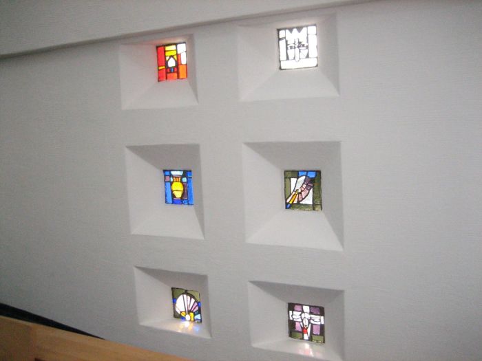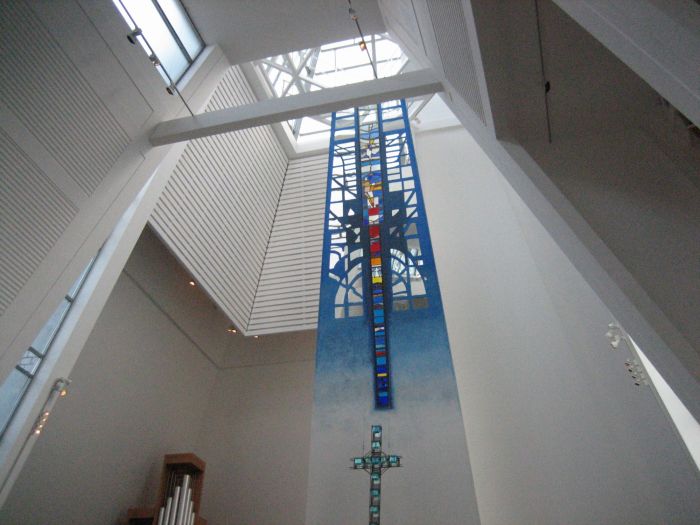 Kirkerommet har galleri innenfor inngangen, men orgelet står nede på kirkegulvet. Kirken er utsmykket av Per Odd Aarrestad. Langs midtgangen mot alteret, som kalles menneskets livsakse, skal det være syv gulvrelieffer. Over selve altertavlen (et alterskap) fortsetter utsmykkingen oppover en atten meter høy akse med et kors i laminert glass og en spalte med glassmalerier. Også i sideveggene er det glassmalerier.