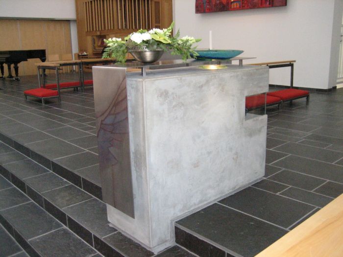 Alter, døpefont og prekestol samt andre liturgiske møbler er tegnet av Aslaug Øyehaug og Benedikte Holmberg. Orgelet er bygget av Jehmlich Orgelbau.