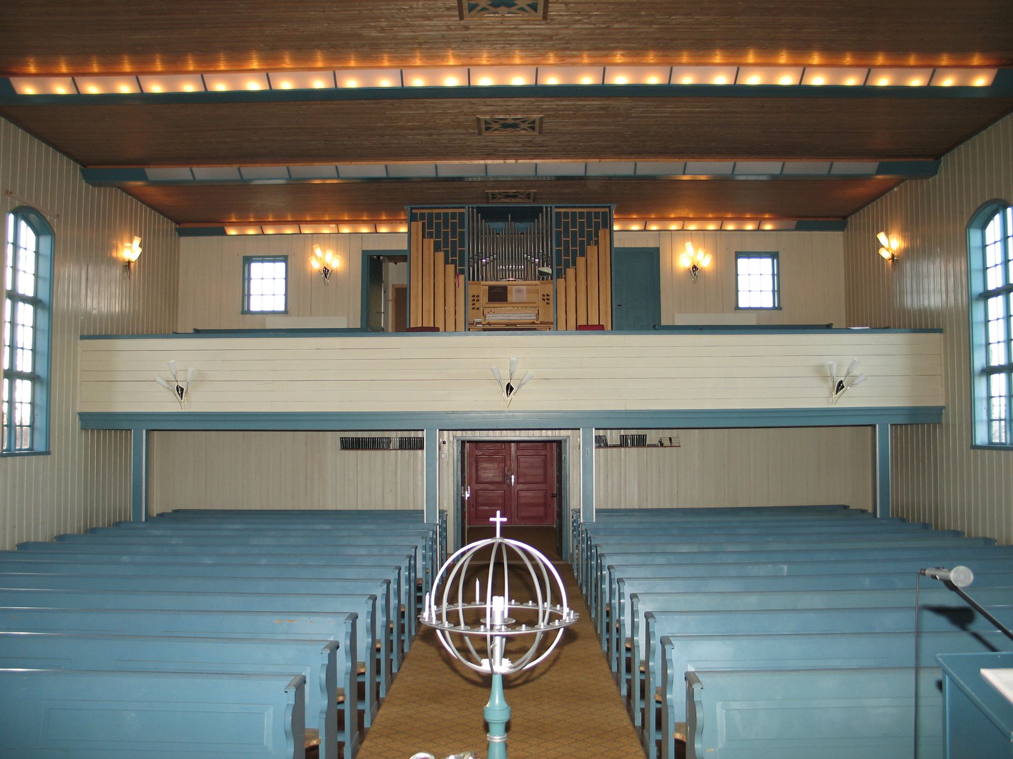 Inne i kirken er det orgelgalleri i vest. Koret åpner seg mot skipet i sin sin fulle bredde, og prekestolen til høyre for koråpningen har oppgang gjennom veggen fra sakristiet. Korgulvet er hevet tre (?) trinn over skipets gulv.