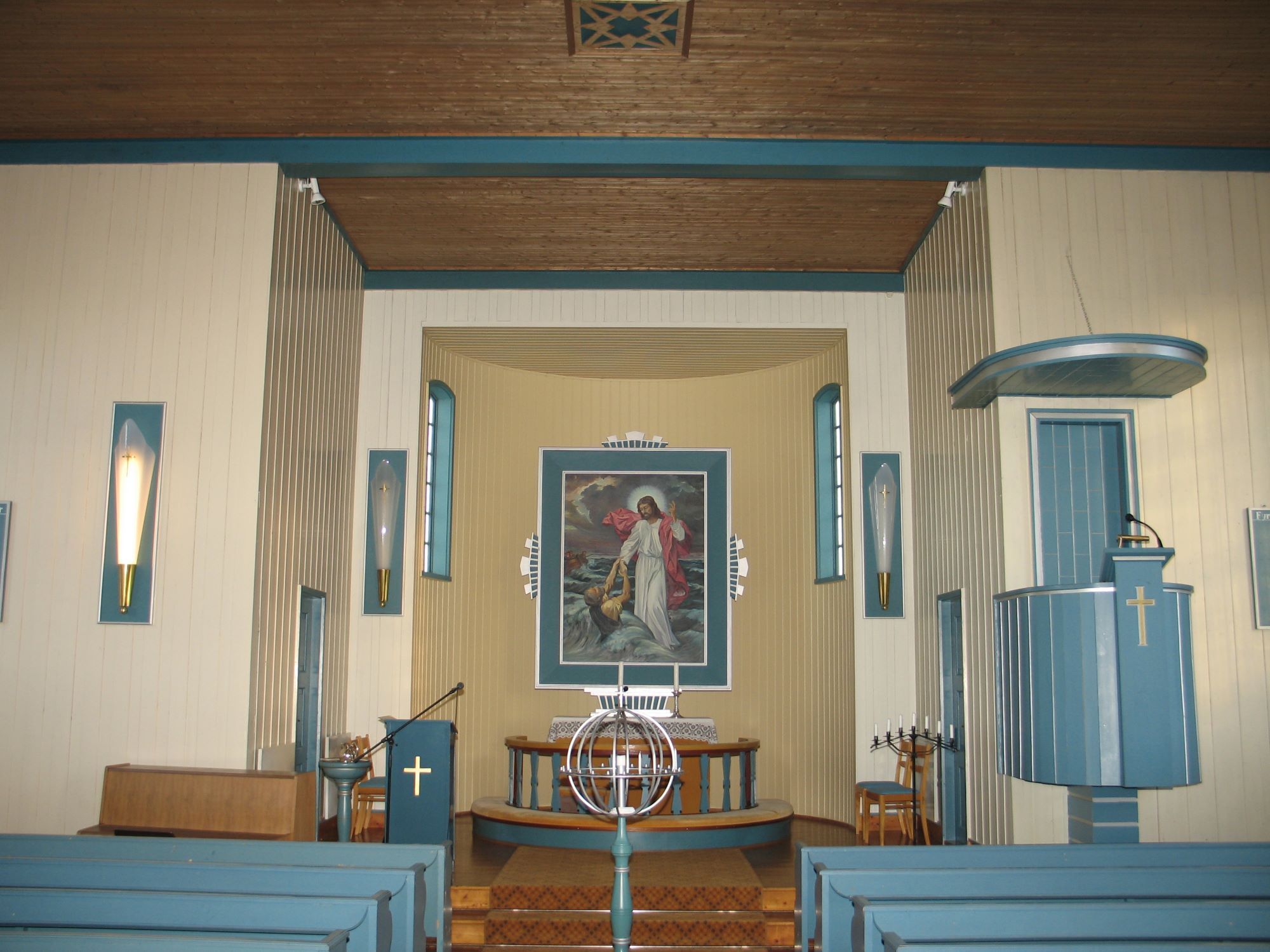 I begynnelsen ble det brukt et kors til altertavle. Det nåværende alterbildet er fra 1959. Det er malt av Ola Angvik i kopi etter Bernhard Plockhorst og viser Jesus som redder Peter fra å drukne i Genesaretsjøen. (Originalen er alterbildet i Dreifaltigkeitskirche i Hannover.) Kirken har ifølge Norsk orgelregister et Vestre-orgel fra ca. 1967.