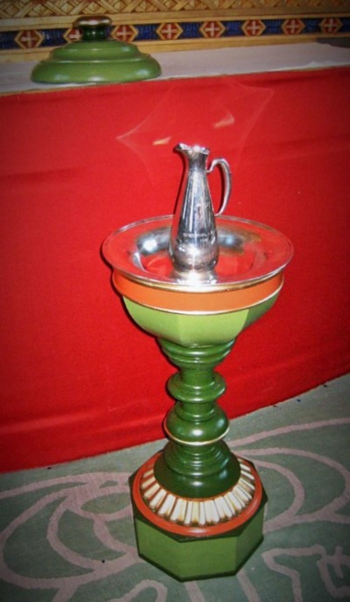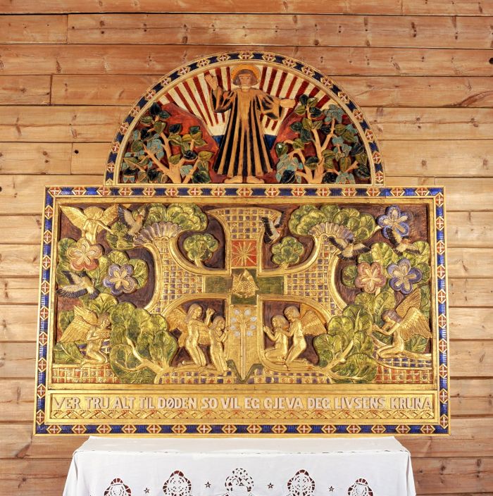 Mye av inventaret er fra da kirken var ny, men til å begynne med brukte man et trekors i en ramme istedenfor et alterbilde. Altertavlen ble laget av Dagfin Werenskiold i 1932, og historien om den tåler å gjenfortelles. Sogneprest Jon Johnson og hans kone Alhed arbeidet for altertavle til kirken og fikk i 1929 tillatelse til å lage en kopi av hans verk «Det blomstrende kors» (eller «Krossen i blomstring»). Etter fylkesarkivets (nå: Kringoms) fremstilling å dømme skar Rasmus S. Kirkhorn ut rammen og innskriften under bildet, mens Jon Johnson skar relieffet. Ekteparet Johnson skal så ha malt rammen, og man ventet på at Werenskiold skulle male relieffet. Werenskiold skal ha vært svært fornøyd med arbeidet, og det endte med at Hornindal kirke fikk overta originalen, mens kopien (som også er signert DW) nå er å finne i Sørkedalen kirke i Oslo.