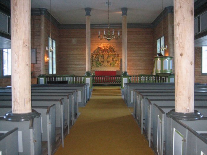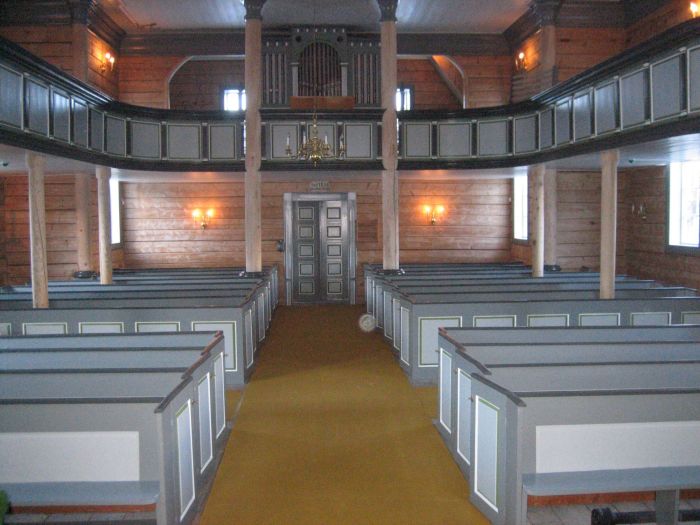 Innvendig var veggene umalt til å begynne med, mens interiør og inventar ellers var hvitmalt (som utsiden). I 1902 ble innerveggene malt med gul som hovedfarge, hvoretter fargen ble endret til perlegrå med rødskjær i 1930. Veggene ble avlutet til jubileet i 1956. Kirken har søylebåret galleri i vest og fremover langs nord- og sørveggen. Også ved korskillet er det søyler, og korgulvet er noen trinn høyere enn skipets gulv.