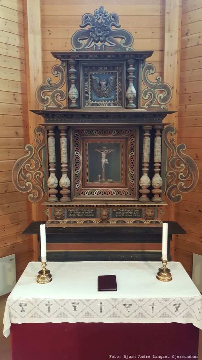 Den barokke altertavlen ble skåret av Jørgen Snekker (eller «Jurgen Snedicher») omkring 1650. Den har et korsfestelsesbilde i storfeltet, og på et engelrelieff i etasjen over er årstallet 1709 malt. For øvrig har tavlen en rekke dreide søyler, og det har vært spekulert i om dette var fordi det var billigere enn å ha utskårne figurer.