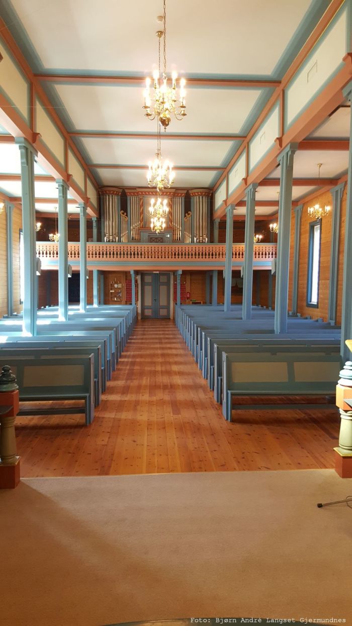 Det er orgelgalleri innenfor inngangen i vest. Koret åpner seg mot skipet i sin fulle bredde, og korgulvet er tre trinn høyere enn skipets gulv. Søylerader og nivåforskjeller i den flate takhimlingen gir kirken et visst treskipet preg.