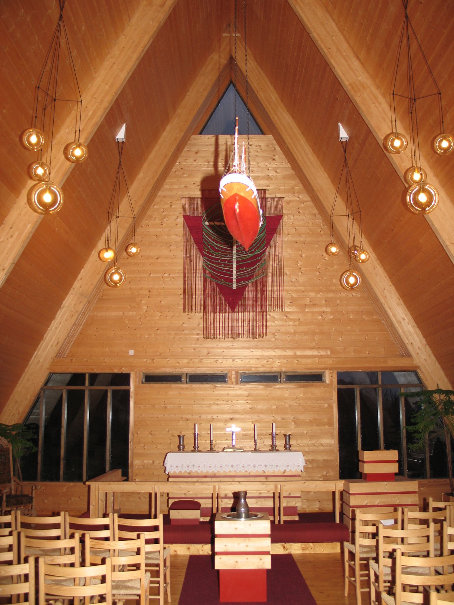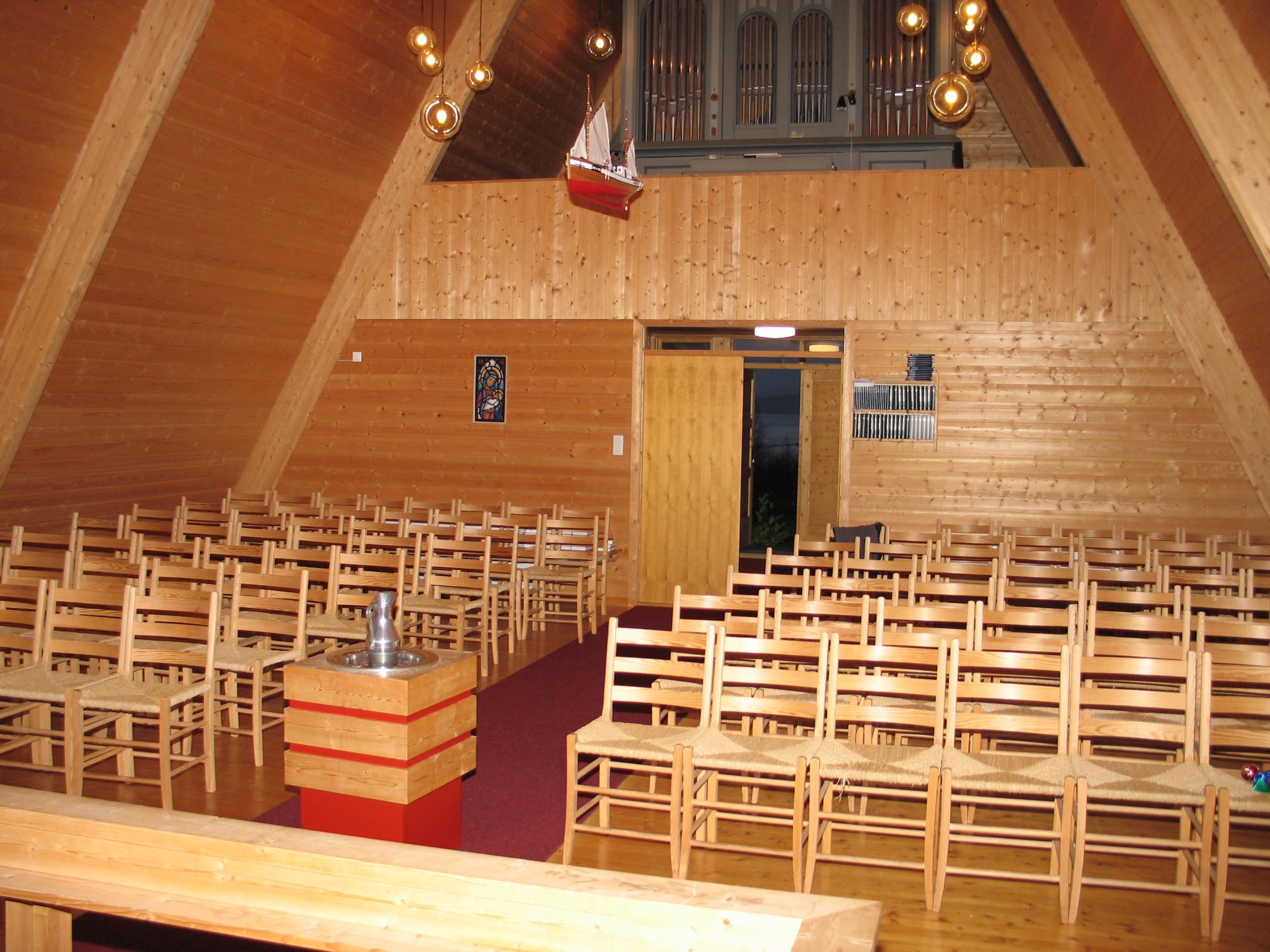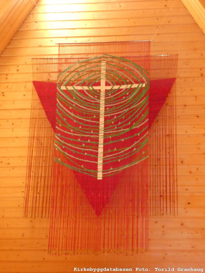 Interiøret og inventaret er for en stor del trehvitt. Det er orgelgalleri innenfor inngangen. Området innenfor alterringen utgjør et podium hevet et lite trinn over resten av kirkerommet. Altertavlen har form av to tepper som henger utenpå hverandre. Det bakerste illustrerer treenigheten og det fremste et kors med tornekroner. Kirkeleksikonet krediterer Gjertrud Hals for disse og daterer dem til 1986. Orgelet er ifølge Norsk orgelregister et Olsen & Jørgensen-orgel fra 1910. To klokker skal være støpt av Olsen Nauen i 1988, men undertegnede klarer bare å se én på bildet av klokekstøpulen hos Kirkesøk.