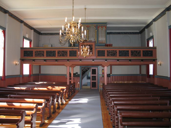 Innvendig er det orgelgalleri innenfor inngangen. Koret åpner seg mot koret i sin fulle bredde, og det er korskille i form av en lav skranke på hver side av midtgangen. Korgulvet er to trinn høyere enn skipets gulv.