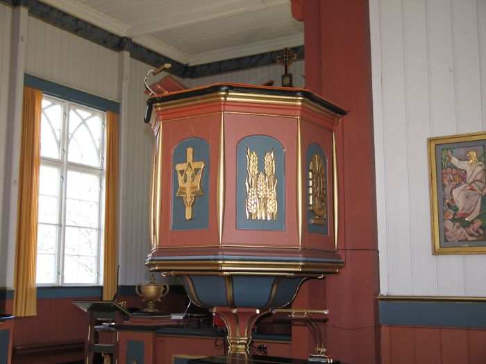 Prekestolen står i koråpningens høyrekant (sør) og ser i likhet med døpefonten ut til å være på alder med kirken. Stolen har trerelieffer skåret av Ola Skrøvseth i 1980–1982 etter forelegg av søsteren Kalla Skrøvseth. De to kirkeklokkene ble støpt ved Trolla Brug i 1869. Orgelet (8/II+P) er ifølge Norsk orgelregister fra Olsen & Jørgensen og ble tatt i bruk 2. juledag 1914. Dette skal ha blitt ombygget i 1971 og restaurert av Espen Selbæk i 2013, idet det ble tilbakeført til opprinnelig stand.