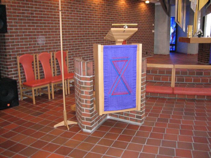 Det vi vanligvis identifiserer som koret, utgjør et podium i hjørnet av kirkerommet, og det er orgelgalleri over inngangen. I et annet hjørne er vinduer med glassmalerier i øyenhøyde og opp langs taket. Disse er laget av Veslemøy Nystedt Stoltenberg i 1991. Nystedt Stoltenberg står også bak alterutsmykningen fra samme år.