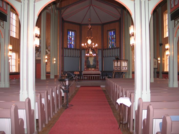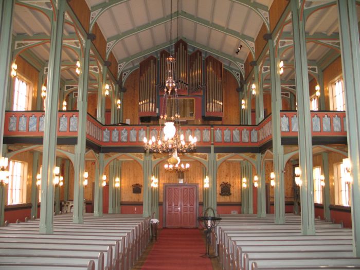 Det er orgelgalleri innenfor inngangen, og gallerier strekker seg et stykke langs langveggene. Koret åpner seg mot skipet i sin fulle bredde, og korgulvet er to trinn høyere enn skipets gulv. Vinduene i korets skråvegger har glassmalerier av Torvald Moseid fra 1980. Prekestolen står i koråpningens høyrekant og har oppgang fra koret (like ved siden av døren til prestesakristiet).