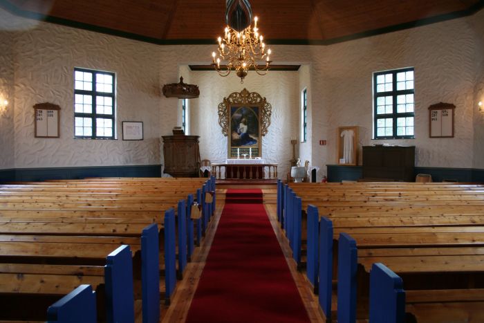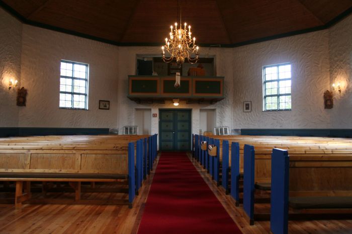 Det er orgelgalleri ved inngangen og altså kor i forlengelsen av åttekanten. Korgulvet er hevet to trinn over skipets gulv.