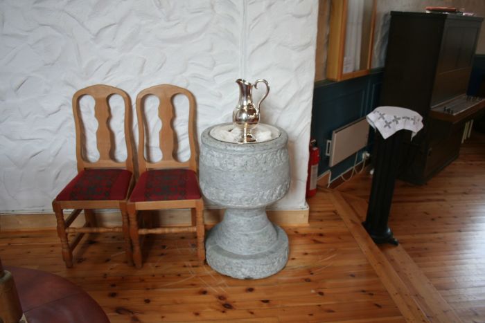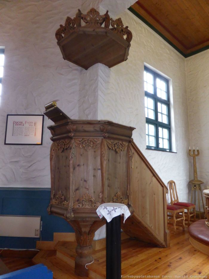 Prekestolen (1950) tilskrives en Hilmo, mens døpefonten (1951) er av kleberstein. Kirkeklokken sies å være støpt i 1950, og kirkeleksikonet opplyser at kirken har et pipeorgel fra 1937. Dette bekreftes ikke av orgelregisteret.