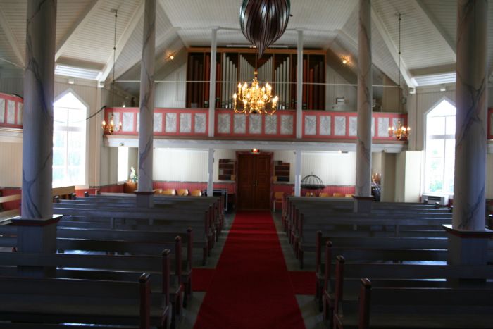 Det er orgelgalleri innenfor inngangen og gallerier også i tverrarmene. Koret (i østre korsarm) åpner seg mot skipet i sin fulle bredde. Korgulvet er hevet to trinn over resten av kirkegulvet. Kirkerommet er møblert med stoler.