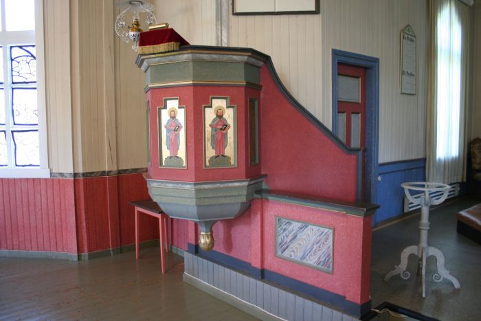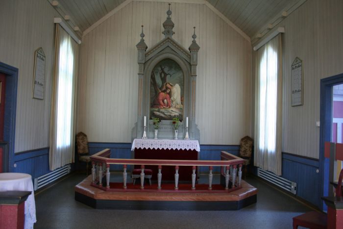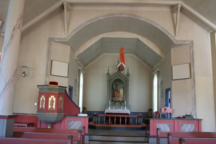 Undersøkt litteratur ser ikke ut til å ha detaljerte opplysninger om inventaret, men noe av det det er avbildet på Kirkesøk. Prekestolen er i koråpningens venstrekant og har oppgang fra koret. Den ser ut til å ha kristusbilder i fyllingene. Altertavlen har muligens et Getsemane-bilde.
