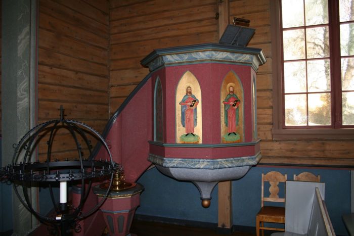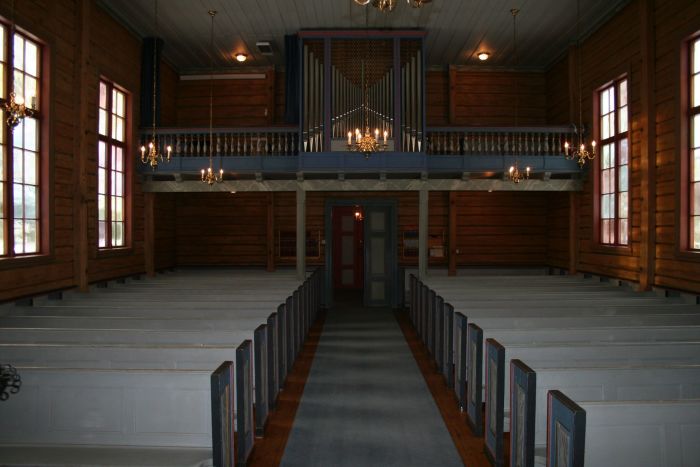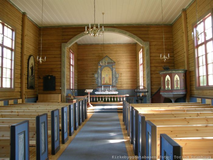 Inne i kirken er det bare laftetømmeret synlig. Det kan se ut til at veggene ble avlutet ved restaureringen i 1958. Koret fikk endret himling ved den anledning, og altertavlen ble byttet ut. (Bilder av før og etter er gjengitt på denne boksiden.) Det er orgelgalleri innenfor inngangen. Koret åpner seg mot skipet i sin fulle bredde, og korgulvet er hevet to trinn over skipets gulv. Prekestolen står i skipets sørøstre hjørne, utenfor koret.