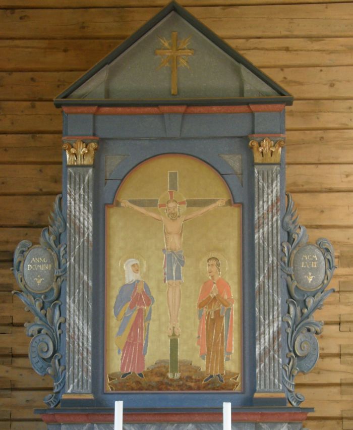Kirkens opprinnelige altertavle hadde en kopi av Adolph Tidemands alterbilde i Tyristrand kirke, ofte kalt «Kristus i skyen». Denne ble altså byttet ut i 1958 og henger nå i øst på skipets nordvegg. Altertavlen som er i bruk, ble skåret av Oscar Lynum, og bildet ble malt av Henry Waade. Det viser korsfestelsen med Maria og Johannes stående på hver sin side av korset. Teksten under bildet lyder: «Ego sum via et veritas et vita», altså «Jeg er veien, sannheten og livet» (Joh 14, 6).
