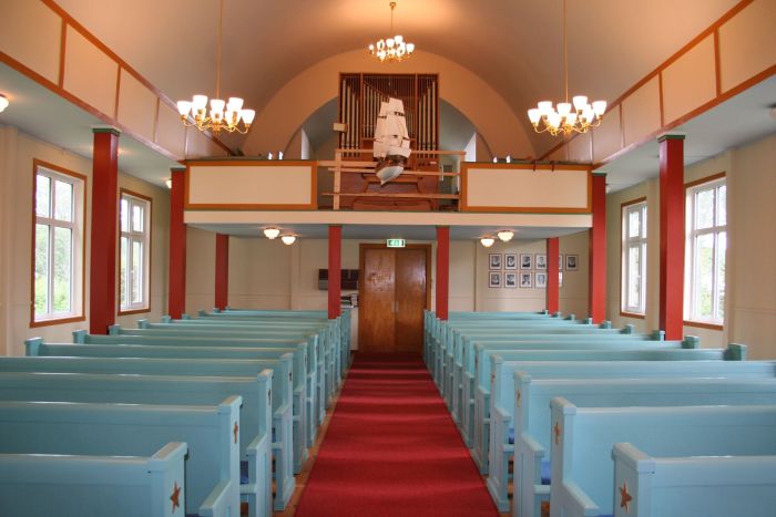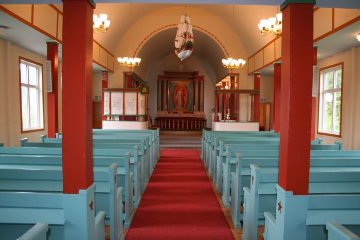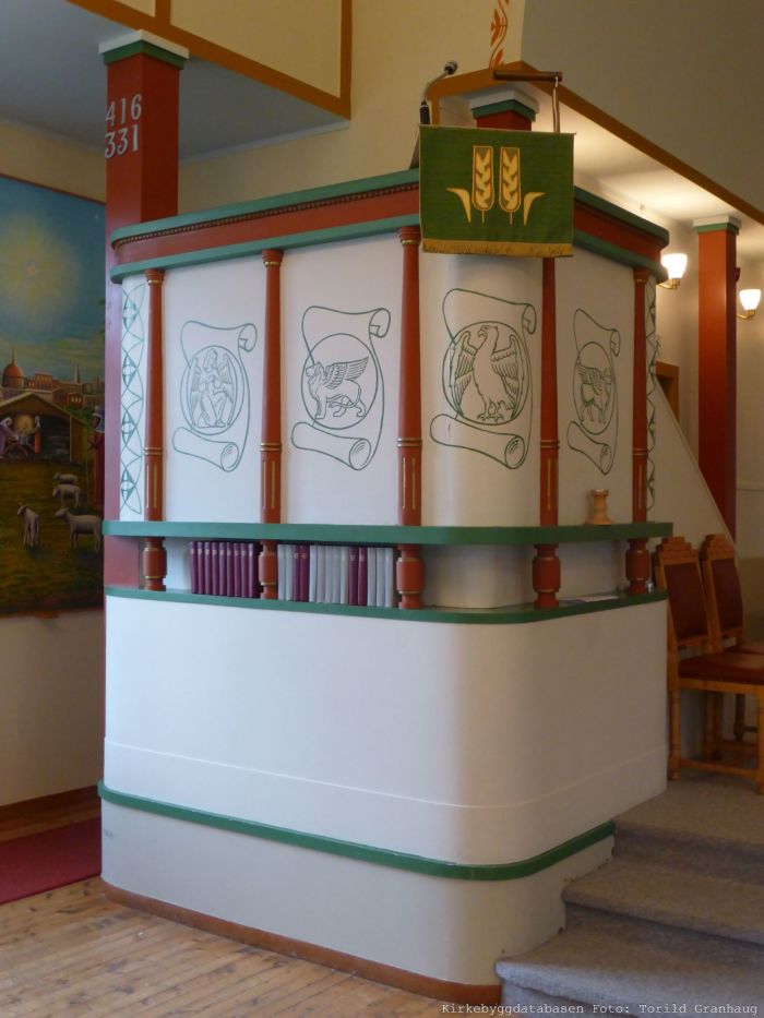 Det er orgelgalleri innenfor inngangen. Selv om kirken har saltak, fremstår den som tønnehvelvet innvendig og med lavere takhøyde og søylerader langs langveggene. Koråpningen er rundbuet, og prekestolen står i dens venstrekant. Korgulvet er hevet tre trinn over skipets gulv.