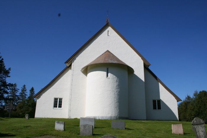 Kirken er omgitt av kirkegården.