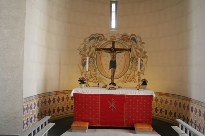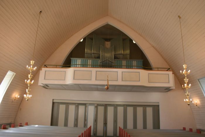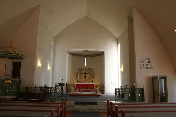 Det er et lite orgelgalleri i vest, og menighetssalen er adskilt fra skipet med foldedører. Koret åpner seg mot skipet i hele sin bredde, og korgulvet er hevet tre trinn over skipets gulv. Koret er flankert av sakristier under samme tak som skipet. Prekestolen er til venstre (nord) og har oppgang gjennom en dør i sakristiveggen. Den skal være fremstilt ved Russånes Fabrikker og er formodentligg formgitt av en av arkitektene.