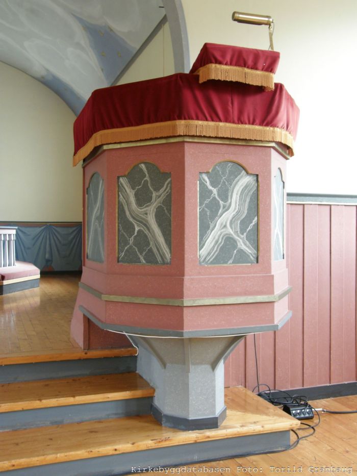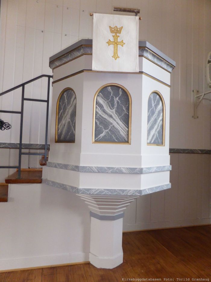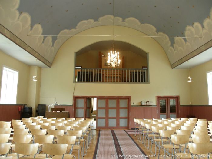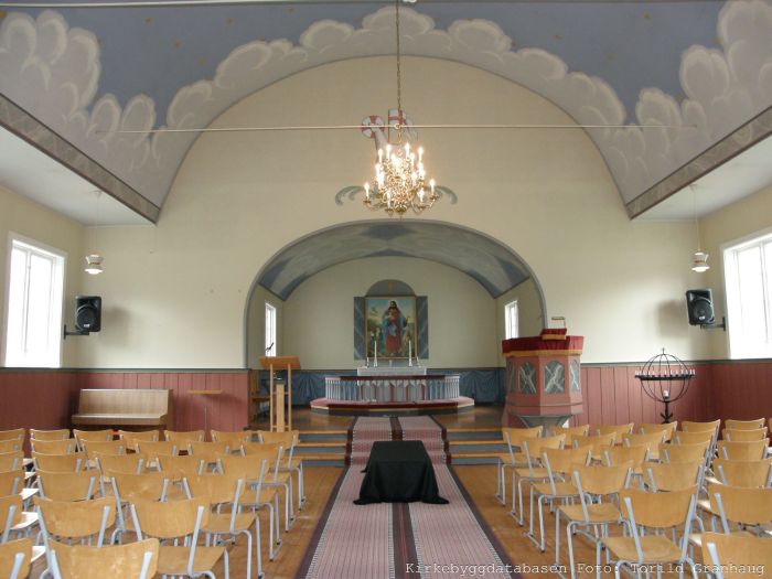 Til tross for saltaket har kirkerommet en slags tønnehvelv, med flat takhimling langs langveggene. Det er orgelgalleri over våpenhuset. Koret åpner seg mot skipet i sin fulle bredde, og korgulvet er hevet tre trinn over skipets gulv. Prekestolen står i koråpningens høyrekant og har oppgang fra koret. Myrvoll skal være ansvarlig for denne og døpefonten. Prekestolen skal være modellert etter stolen i Halsa kirke i Meløy.